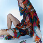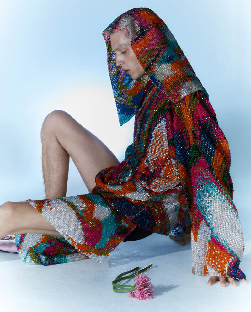 This couture piece is entirely hand woven from Czech phenomenon fire polished glass beads. The overall production of this piece is very time consuming. About 50,000 glass beads and about 1.8 kilometers of thread are used for this piece.